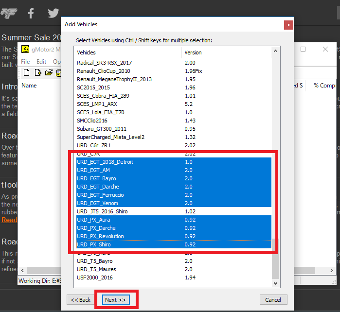 コースの次は使用車種を選択します。混走レースなどではShift、Ctrlキーなどで複数選択できます。車種が決まったら、Nextをクリックします。